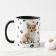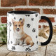 An adorable Pembroke Welsh Corgi Dog looks out at you on two sides of this mug. The text between the two images says "On the 8th day, God created the CORGI and called it VERY GOOD". The dog images and the white oval banner containing the text fields are placed on a white background with black paw prints. Cute!
