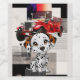 A vintage red fire truck is depicted against a collage-style background, featuring geometric patterns and abstract designs. In the foreground, an adorable cartoon Dalmatian with expressive eyes adds a playful touch to the scene. Digital Art