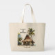 Featuring a charming depiction of a thatched brown-roofed tiki hut beach house on stilts, nestled on a sandy beach, this beach bag transports you to a tropical paradise. With a palm tree adorning the right side and lush tropical foliage on the left, the scene exudes tranquility and serenity.