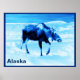 A monochrome (blue) image of a cow moose walking in snow. Text reading "Alaska" also appears. Moose are year-round residents in many northern communities. Here in Anchorage there are about 1500 animals, along with wolves, brown bears and other wildlife.They are usually well-behaved. They often cross streets at the crosswalks after waiting for a walk signal.