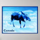A monochrome (blue) image of a cow moose walking in snow. Text reading "Canada" also appears. Moose are year-round residents in many northern communities. Here in Anchorage there are about 1500 animals, along with wolves, brown bears and other wildlife.They are usually well-behaved. They often cross streets at the crosswalks after waiting for a walk signal.