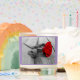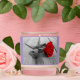 A quaint rose accented with a black and white background of wooden planks.