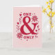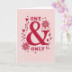 This greeting card centers on the words “ONE & ONLY” against a soft pink background. “ONE” sits at the top and “ONLY” sits at the bottom in uppercase lettering, with a large ampersand in the middle that has smooth, curling lines. The text and decorations use reds and deeper pinks, which makes the message feel warm and loving ❤️. Small red hearts are sprinkled around the words and along thin vine shapes that weave through the design. Two larger flowers with many petals, drawn in a lighter pink outline, sit on either side of the ampersand like gentle bookends. The layout feels balanced and easy to read, and the mix of hearts and flowers makes the message feel caring without needing extra words 🥰. It’s a meaningful way to tell someone they’re truly special and to share Valentine’s Day sentiments.