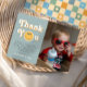 This groovy boys 1st birthday thank you card captures retro 70s vibes with a cute blue smile theme, and a pastel blue chequered pattern on the back. Fully customizable, it includes space for your message, a photo and name. Perfect for a "One Cool Dude" boho birthday.