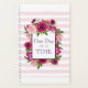 A weekly/monthly planner with an inspirational motivational quote which says: One Day at a Time. Designed with a floral bouquet composed of light pink roses and dark pink poppies with lots of lush green leaves. A frame layered over top with the quoted text inside. The background is a soft pastel pink striped pattern. The back of the planner is a solid pink background.