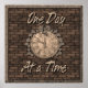 Aged wall with a old clock and the words One day at a time. This slogan is heard throughout the 12 step programs of recovery. This recovery slogan is available on T-shirts, sweatshirts, hoodys in many colors and styles for men and women. Check out the cards, mugs, hats, canvas totes, and gift items available with this recovery slogan.