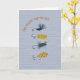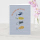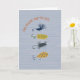 This cute and punny Father's Day folded greeting card has hand drawn flies for fishing on a striped background and reads "Dad, you're one fly guy." The inside reads "Wishing you a reelaxing Father's Day" and features a hand drawn fishing pole. This card is perfect for the dad who loves fly fishing and dad jokes.