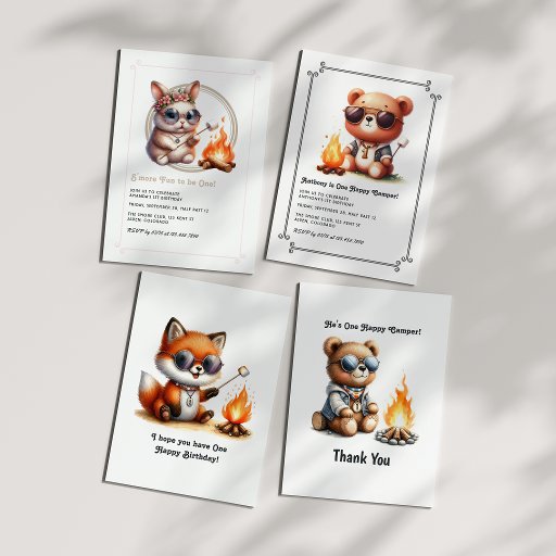 Celebrate your little adventurer's big day with this charming "One Happy Camper" gift bag featuring an adorable chickadee birdie and an owl in sunglasses, roasting s'mores by the fire. Perfect for a rustic camping-themed first birthday, this woodland-inspired design blends cozy outdoor vibes with playful party charm. Ideal for party favors, s'more kits, or nature-inspired gifts.