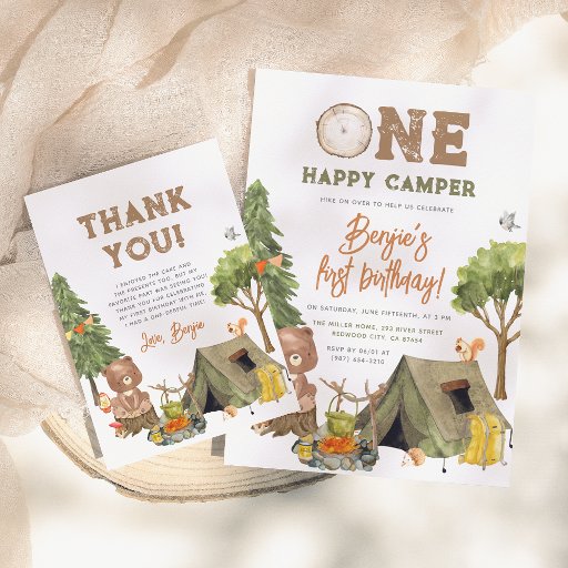 One Happy Camper Woodland Bear Boys 1st Birthday Invitation
