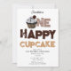 A beautiful hand drawn chocolate cupcake birthday invitation design. A cute "One happy cupcake" chocolate themed first birthday party invitation. A cute cupcake themed birthday invitation that can be customized to your details.