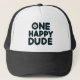 Top off your look with a burst of cheer with the "One Happy Dude" cap! This accessory isn't just a statement piece, it's a declaration of joy. With its bold and simplistic smiley design, this hat is sure to bring a dose of happiness to your day and spark smiles on those around you. Crafted for comfort and style, it's the perfect cap for sunny days out or just when you need to remind yourself to stay positive. The versatile design pairs easily with casual outfits, making it a staple for any feel-good wardrobe. Add a touch of playfulness to your attire and keep the good vibes going strong with this happy-go-lucky cap.