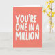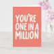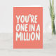 Designed with a warm coral-salmon background, this card keeps the focus on one strong message that feels like a close, caring note ❤️. Centered in the middle, the phrase “YOU’RE ONE IN A MILLION” appears in soft white lettering that stands out clearly against the solid color field. The letters have slightly uneven, brushy edges, giving the words a human touch, like they were painted by someone who truly adores the reader. With no characters or scenery competing for attention, the open space around the text feels calm and intimate, like a quiet moment shared between two people. The layout is straightforward: the text sits squarely in the center with generous breathing room on all sides, making it easy to read at a glance. The warm background color adds a gentle glow that suggests affection and closeness without needing extra decoration 🌼. The front shows a single line of soft white, slightly rough-edged lettering centered on a smooth coral-salmon field.
