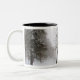 One leaning tree in a snow covered path Two-Tone coffee mug