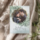 Engagement announcement cards are perfect for when you don’t have a wedding date set, but you can’t wait to share the good news with your friends and family! This elegant design features watercolor eucalyptus greenery bouquets and gold geometric frame around the photo, with the announcement “Two Hearts, one Love” and an engagement ring in the word Love, along with the couple’s names and date and place of engagement. The background is dusty blue watercolor texture.