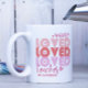 One Love Teacher Pink Modern Personalized Name Coffee Mug features the text "one loved teacher" in modern pink script typography accented with love hearts and personalized with your custom name. Perfect for your favorite teacher for teacher appreciation, birthday, Christmas, holidays and more. Designed by Evco Studio www.zazzle.com/store/evcostudio