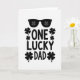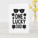 This card features a white background with the phrase “ONE LUCKY DAD” centered in strong black sans-serif letters, giving the message a confident, straightforward look 💚. The words stack neatly, with “ONE” above “LUCKY” and “DAD” below, creating a balanced layout that feels steady and proud. Above the text sits a pair of black sunglasses, like Dad just stepped into the scene with a relaxed grin and someone close by admiring him. Inside the lenses, small four-leaf clovers appear as reflections, adding a sweet touch of good fortune ☘️. More clovers are sprinkled around the lettering, tucked near “ONE” and “DAD” and dotted between “LUCKY” and “DAD” like little lucky confetti. The black-and-white color scheme keeps everything sharp and easy to read while letting the shamrocks stand out as the main decoration. The clovers are tiny, simple shapes placed around the words and echoed again in the sunglasses lenses at the top.