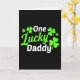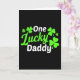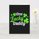 This design shows the phrase “One Lucky Daddy” centered on a deep black background, with “One” and “Daddy” in bright white, simple sans-serif lettering that feels steady and proud. “Lucky” sits between them in lime green, drawn in a flowing handwritten style that adds a softer, affectionate touch, like someone wrote it with a smile 💚. Small shamrocks are scattered around the words, echoing the same green and giving the layout a festive St. Patrick’s Day feel ☘️. A larger four-leaf clover appears close to “Daddy,” like a little nod of admiration from someone who’s clearly fond of him. The strong contrast between the black backdrop and the white-and-green text makes the message pop, as if it’s lit from within. The spacing keeps the phrase easy to read, with “Lucky” slightly more eye-catching due to its color and curving strokes. Several clovers vary in size, with a few three-leaf shapes sprinkled near the top and sides and the standout four-leaf clover tucked near the lower text.