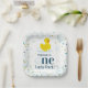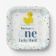 "One Lucky Duck" first birthday party theme featuring rubber duck surrounded by confetti, bubbles and blue text.
