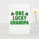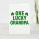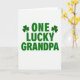 This card features the big, all-caps phrase “ONE LUCKY GRANDPA” centered on a bright white background, with the words set in deep emerald green 💚. The numeral “ONE” sits prominently near the top, and a small three-leaf shamrock appears on each side of it, like two little good-luck nods leaning in close ☘️. Below that, “LUCKY” and “GRANDPA” stack in the same strong, sans-serif lettering, giving the layout a steady, confident rhythm. The wide open space around the text makes the message feel like it’s being presented with a proud, affectionate grin, as if the giver is standing nearby with a warm hand on Grandpa’s shoulder. The green ink against the white field creates sharp contrast, keeping everything easy to read at a glance while still feeling festive. The shamrocks act like gentle bookends, adding a touch of St. Patrick’s Day charm without crowding the design. Two matching green shamrocks flank the word “ONE” above the stacked lines of “LUCKY” and “GRANDPA” on the white front.