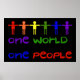 Rainbow figures link arms and stand on the words: "One World One People" to get the message out that world peace starts with us. We must get along with each other before we can have peace.