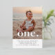 A simple First Birthday invitation featuring your own photo and the words 'one.' over the top, in real silver foil.