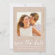 Elegant and chic gold, blush and ivory color palette. Your photo is surrounded by a gold frame with a modern ivory white dot pattern on its interior. Save the date is written in a beautiful script font. Your names, wedding date and location follow. The postcard back is edged in the same white dot on blush pattern. Your wedding details are on the blush background that is also surrounded by a gold frame.