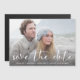 Chic and elegant save the date magnet features your photograph with a white script save the date overlay. It is designed to complement any picture. The white will show up even against white or cream as you can see in the sample photo. Your wedding date, location and names follow in a classic serif white text.