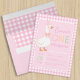 The background is pink and white gingham checkered plaid pattern. On the left, there is a cute white goose with a pink party had and a pink bow at its neck. On the right, there is the text inside a pink circle with white border. The word ONE has each letter in a different color. The name is written in a pink script. The message "Welcome to" is arched text.