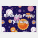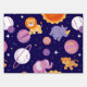 a space-themed pattern. This pattern features a variety of celestial objects and animals. There are planets of different sizes and colors, such as purple, orange, and yellow, along with a bright sun. Additionally, there are animated animals, including a pink elephant, a yellow lion, and a purple hippopotamus, floating amidst the celestial bodies. The background is a deep black, accentuating the bright colors of the planets and animals.