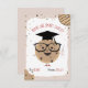 Illustration of a chocolate chip cookie with face, arms and legs wearing glasses and a graduation cap holding a bottle of milk with straw surrounded by cookies and confetti. Text says, "You're one smart cookie"