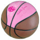 Pink personalized basketball. The design has pink panels, one of which can be customized with your choice of name and team. The top panel has the quote "one team one dream" lettered in decorative typography with a pink basketball. A great gift for a girl basketball player.