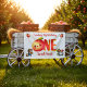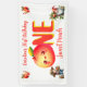 Decorate your celebration space with this whimsical first birthday party banner. The design features a delightful storybook scene with a kawaii peach character, a garden gnome, and a harvest girl in a sun-drenched orchard. Hang this vibrant backdrop behind the dessert table or high chair to create a perfect photo opportunity for your child's big milestone.