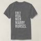 My 11 yo wore adult XL (5’7” 165#). The 8yo is small framed. She wore adult small and tied it in the back. Dark haired male wore adult large and 5’9”, 110# female wore adult medium . Good quality dark Heather gray, Gildan brand shirt. -it was next up from basic choice and cost about $20 per shirt. Not too thick or thin. Washed and dried well, no major shrinkage. Not see-through. Can wear a bra under it fine. Screen print is just as shown and well done, front and back.