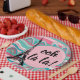 These paper plates have a French flair - a silhouetted Eiffel Tower and "ooh la la!" within a pink disc. The background is a modern, wavy design in pink and aqua. Want to change the text? Just tap "Edit Design": "Edit text". Check out my matching napkins, coasters, etc. by tapping my shop name.