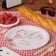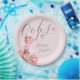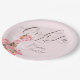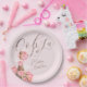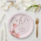 Ooh La La Paris Bridal Shower paper plates with pink florals and eiffel tower and scripted calligraphy lettering.
