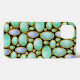 A pretty opal brooch pendant pattern with gold chains. This unique printed design is made to look like turquoise blue opals arranged in a sort of mosaic on a black, customizable background. The oval shapes have an opaque mother-of-pearl look with swirls of blue, green and white. It's a beautiful, original pattern.
