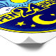 Retro design with half of a circle displaying a sun design and the bottom a moon design. In the center is "Open 24 Hours". Colors are blue and yellow