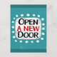 "Open A New Door" is a cute inspirational or motivational quote with a white accent shape surrounded by white textured whimsical dots.