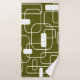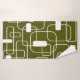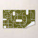 This towel set has a mid-century modern design of open and closed rectangles in white on a field of camo green.