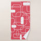 This towel set has a mid-century modern design of open and closed rectangles in white on a field of retro red.