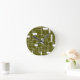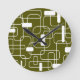 This clock has a mid-century modern design of open and closed rectangles in white on a field of camo green.