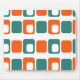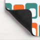 This mouse pad has a mid-century modern design of repeating orange rectangles with white rectangles inside alternating with teal rectangles.