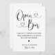 Open Bar wedding sign features modern calligraphy script with heart accents, paired with a custom quote and monogram of the bride and groom's names and wedding date. Black and white colors can be modified.