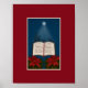 Wish someone special a Merry Christmas with this religious holiday image featuring a nativity in silhouette and an open Bible showing the verses Luke 2:12-14. Two red poinsettias appear in the two bottom corners of the image while a bright star casts a silvery glow over the Christ child. The background of the image is a deep blue and the is finished with a dark red border. Customize the product by adding your own caption.