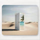 A white door stands open in the middle of a desert, revealing a lush beach scene with a palm tree and ocean