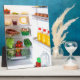 Open fridge filled with food plaque
