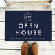 Modern Open House Real Estate Door Mat Template in a modern mininalist style on a stylish navy blue background. Easily upload your company logo for your real estate business and add your contact details (telephone, email, social media and more). The perfect accessory for any realtor or property listing agency!