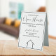 This sleek black and white Open House table tent sign is custom made with your realty company name and realtor contact details. Impress new home buying clients with this chic, simple signage with this classy typography sign. A modern, minimalist line drawing of a house sits under the real estate agent information.