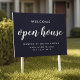 A modern open house property listing design template featuring an informal casual handwritten script font on a stylish black background. Easily add your name and contact details (telephone, email, social media and more). The perfect accessory for any realtor or property listing agency!