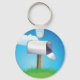 This design is an open mailbox. The mailbox is white and is set on top of a green hill against a blue sky. This open mailbox design looks great